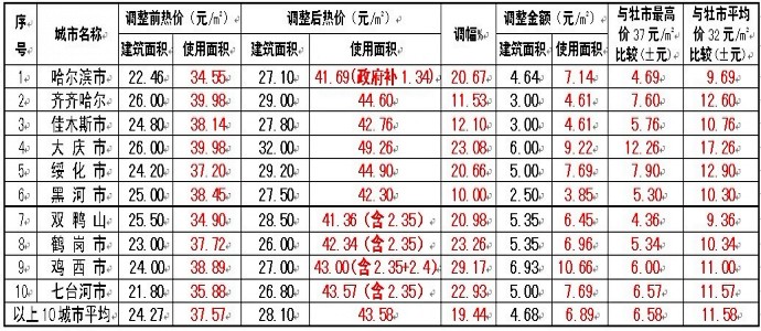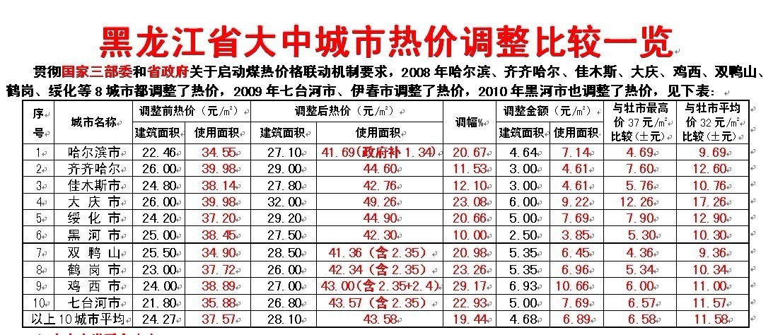 貫徹國家三部委和省政府關(guān)于啟動(dòng)煤熱價(jià)格聯(lián)動(dòng)機(jī)制要求,2008年哈爾濱、齊齊哈爾、佳木斯、大慶、雞西、雙鴨山、鶴崗、綏化等8城市都調(diào)整了熱價(jià),2009年七臺(tái)河市、伊春市調(diào)整了熱價(jià),2010年黑河市也調(diào)整了熱價(jià),見下表: